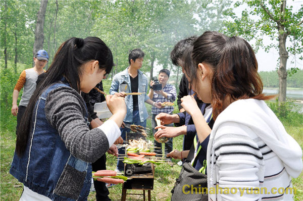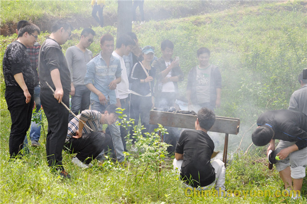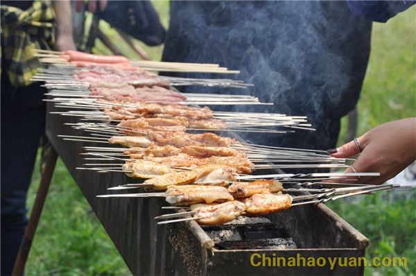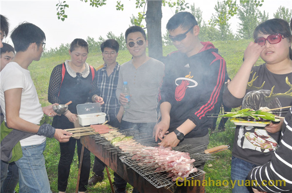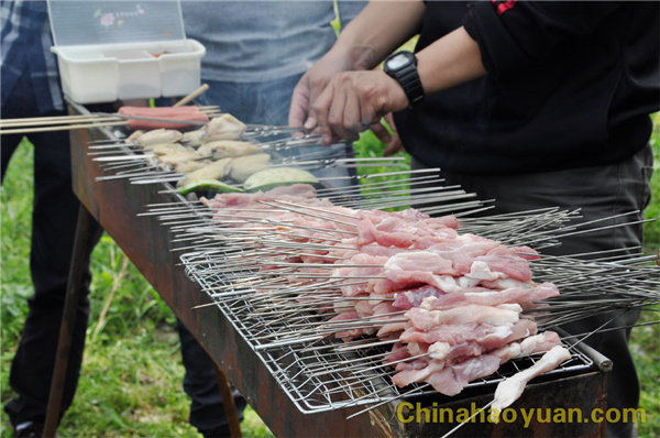 稍作休息,大家便開(kāi)始了此次燒烤活動(dòng)的準(zhǔn)備工作,拾柴火、生爐子、串肉串,一片熱火朝天的忙碌景象。