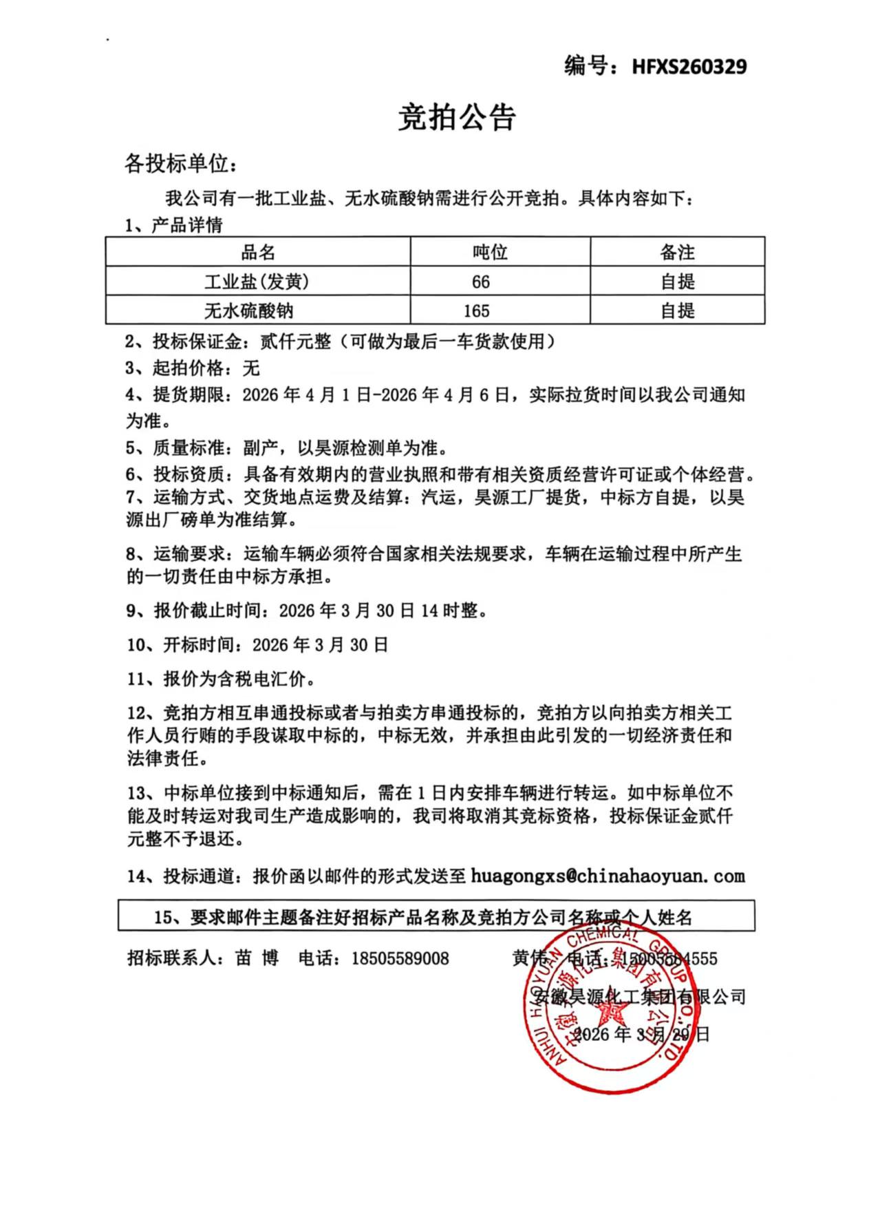 上一條:一批無水硫酸鈉、工業(yè)鹽招標銷售公告下一條:一批無水硫酸鈉、工業(yè)鹽招標銷售公告