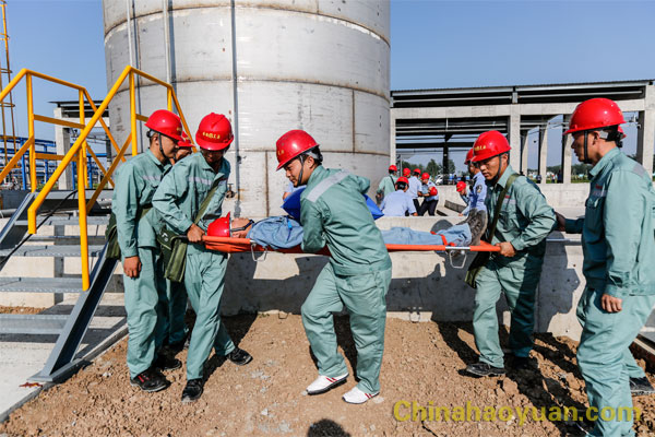 演練假想昊源公司園區(qū)正在建設(shè)的年產(chǎn)6000噸二甘醇胺項目配套罐區(qū),某防腐公司4名員工對在建二甘醇胺儲罐內(nèi)部進行防腐受限空間作業(yè),因天氣炎熱,通風(fēng)不良,2名工人在罐內(nèi)工作時先后暈倒,外面監(jiān)護的1名工人呼叫沒有反應(yīng),隨即進入罐內(nèi)施救,罐外還留一名工人監(jiān)護。進入罐內(nèi)救援的工人告訴外面監(jiān)護人員,罐內(nèi)悶熱,呼吸困難,正準(zhǔn)備將2名工人移出罐外,但是在移動罐內(nèi)人員時感覺乏力,無法移動,施救人員也暈倒在罐內(nèi)。罐外監(jiān)護的工人趕緊尋求幫助,正好遇見路過此處巡檢的操作人員,操作人員迅速了解情況,緊急將情況匯報公司領(lǐng)導(dǎo)。公司領(lǐng)導(dǎo)立即組織人員自救,聯(lián)系120急救中心人員救援,并逐級向市應(yīng)急局、市政府匯報事故情況。