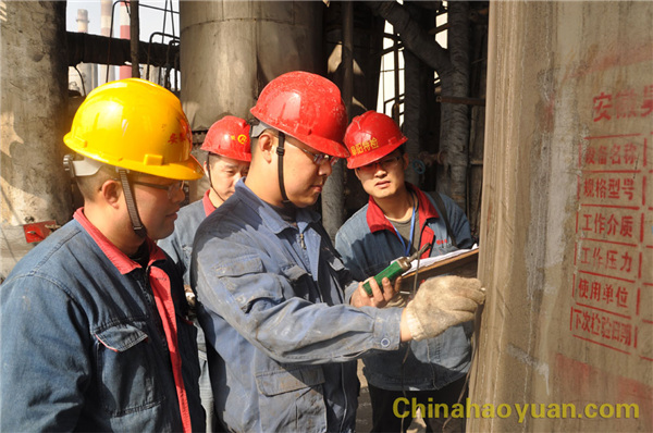 圖為動(dòng)力處和阜陽(yáng)市特種設(shè)備監(jiān)督檢驗(yàn)中心有關(guān)人員對(duì)設(shè)備進(jìn)行檢測(cè)。