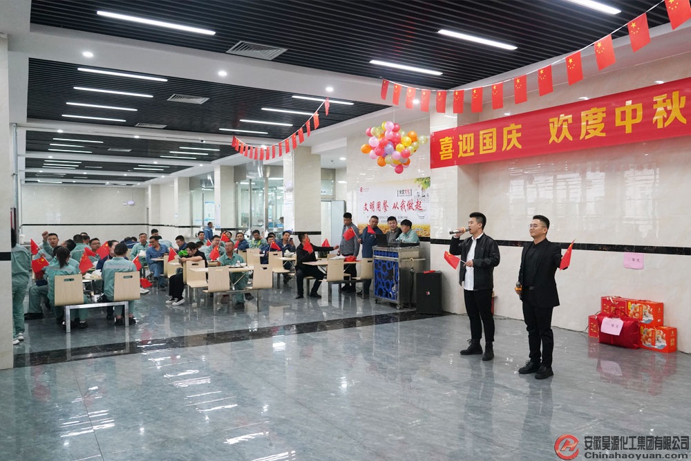 在園區(qū)北區(qū)餐廳燈火通明、人頭攢動,公司領導高明林、吳珍漢、張超帶領大家揮舞著國旗,臺上臺下齊唱《我和我的祖國》,用歌聲表達昊源人對祖國的熱愛之情,將活動推向高潮。