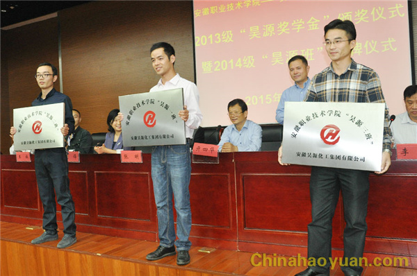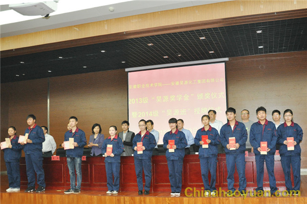 10月23日,安徽職業(yè)技術(shù)學(xué)院2013級(jí)“昊源獎(jiǎng)學(xué)金” 頒獎(jiǎng)儀式暨2014級(jí)“昊源班” 授牌儀式在安徽職業(yè)技術(shù)學(xué)院圖書館三樓報(bào)告廳隆重舉行。公司副總經(jīng)理?xiàng)罱荨⑵蠊芴幪庨L張明、擴(kuò)建辦副主任沈獻(xiàn)、安徽職業(yè)技術(shù)學(xué)院院長亓四華、副院長史鋒、化學(xué)工程系主任方向紅等出席頒獎(jiǎng)授牌儀式。