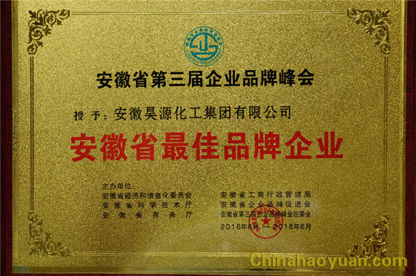 2016年6月18日,由安徽省經(jīng)濟(jì)和信息化委員會、安徽省科學(xué)技術(shù)廳、安徽省商務(wù)廳、安徽省工商行政管理局和安徽省企業(yè)品牌促進(jìn)會共同舉辦的安徽省第三屆企業(yè)品牌峰會在安徽省人大會議中心隆重舉行,省有關(guān)領(lǐng)導(dǎo)及企業(yè)代表100余人出席會議。安徽昊源化工集團(tuán)有限公司在本屆企業(yè)品牌峰會上榮獲“安徽省最佳品牌企業(yè)”稱號,并被授予安徽省企業(yè)品牌促進(jìn)會理事單位。