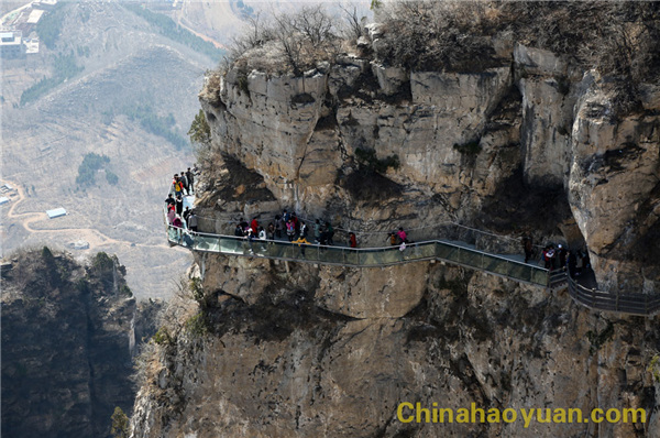 云臺山紅石峽谷長約350米,東西對峙,紅色的石層與綠寶石色的泉水相互輝映,創(chuàng)作出一幅幅美麗的圖畫!大家在感嘆著大自然神奇的同時(shí),也挑戰(zhàn)了最具刺激驚險(xiǎn)的玻璃棧道,大家手牽著手、肩并著肩小心翼翼地登上玻璃棧道,欣賞雄偉壯觀的奇峰俊嶺,方知“會當(dāng)凌絕頂,一覽眾山小”,心情激動無比!