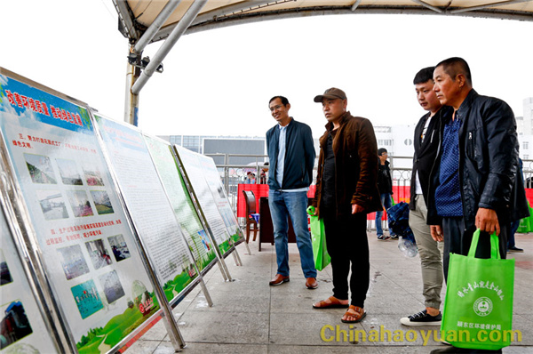 在昊源公司環(huán)保宣傳展臺前,市民或駐足觀看展板介紹,或向工作人員咨詢環(huán)境保護常識。