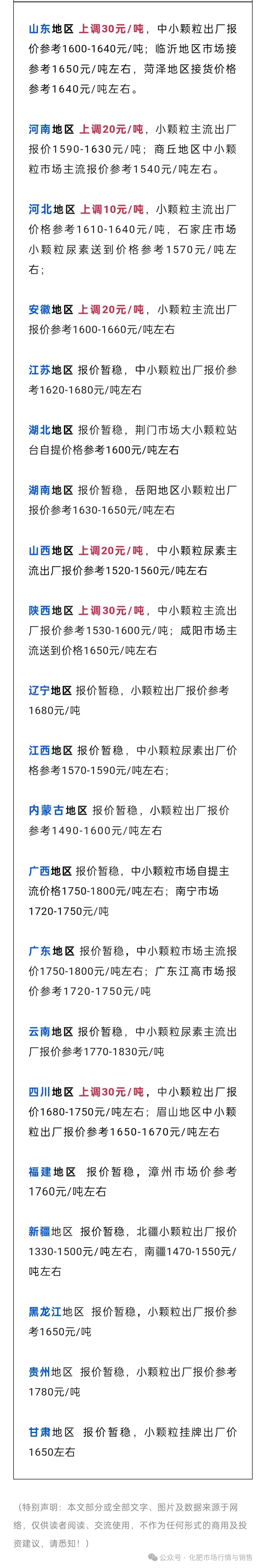受需求增多、印標(biāo)價(jià)格上漲及尿素期貨行情連續(xù)大幅上漲影響,國(guó)內(nèi)尿素現(xiàn)貨價(jià)格大范圍上漲,調(diào)整幅度10-30元/噸。目前尿素日產(chǎn)量維持在20萬(wàn)噸左右,供應(yīng)壓力仍存。需求端以復(fù)合肥與板材行業(yè)剛需為主,整體改善有限,市場(chǎng)觀望情緒較濃。隨著尿素期貨行情上漲,預(yù)計(jì)短時(shí)間內(nèi)尿素價(jià)格或?qū)⒄鹗幾邚?qiáng)。